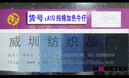 幅寬:150cm 品名:純棉牛仔 密度:64*47 貨號:A10純棉加色 重量:* 具體用途:休閑服、工作服、褲裝、時(shí)裝 別名:A10純棉加色 成分及含量:100%棉 主要用途:服裝用布 ======================================================================= 以上產(chǎn)品全部現貨供應,可隨時(shí)提供樣布卡和現貨,隨時(shí)發(fā)貨。所有產(chǎn)品全部是廠(chǎng)家直銷(xiāo)價(jià),我們承諾:以超低利潤營(yíng)銷(xiāo),我 們只求銷(xiāo)售量。為保證您的利益,我司建議您在采購前先確認我們的品質(zhì)樣與顏色樣后再拿大貨,期待與您的真誠合作。因產(chǎn) 品種類(lèi)較多,具體參考未盡詳盡,如有需要,請您與我們聯(lián)系。 瑞豐紡織(中大旗艦店)坐落于國內最大的紡織面料產(chǎn)業(yè)中心—廣州中大,是一家專(zhuān)業(yè)銷(xiāo)售面料的廠(chǎng)家直銷(xiāo)商。主要經(jīng) 營(yíng)產(chǎn)品有:全棉凈色、仿記憶絲面料、全棉(TC)色織等,面料品種花達上千余種,所有產(chǎn)品全部現貨經(jīng)營(yíng)。 我們面料的品質(zhì)來(lái)源于:1、采用國內外優(yōu)質(zhì)的原材料;2、使用精良的生產(chǎn)工藝和設備;3、完善的生產(chǎn)質(zhì)量管理體系。我 們具有開(kāi)發(fā)和創(chuàng )新品種的強烈意識和優(yōu)越條件,并根據客戶(hù)需求與市場(chǎng)變化時(shí)時(shí)推出潮流面料。憑著(zhù)多年的專(zhuān)業(yè)行業(yè)經(jīng)驗,根 據客戶(hù)需求,不論客戶(hù)在全國任何地方,只要提供小樣,就可在一兩天時(shí)間內輕松獲得所需面料的信息。 批發(fā)說(shuō)明供應商支持混批 。 ============================================================= 有意請加QQ:1295021910或電話(huà)聯(lián)系。 公司名稱(chēng):威圳紡織品廠(chǎng) 聯(lián)系人:陳修喜先生 手機:13650817858 網(wǎng)址:http://www.gzweizhen2010.cn.alibaba.com =============================================================