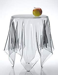 硬質(zhì)腈綸材質(zhì),手工打造,顛覆人們對桌子和桌布的慣常理解。我們見(jiàn)慣了四條腿的桌子和桌子上垂下的柔軟的桌布,這次看起來(lái)貌似柔軟的透明桌布居然四只腳立在地上,是不是很新奇呢?