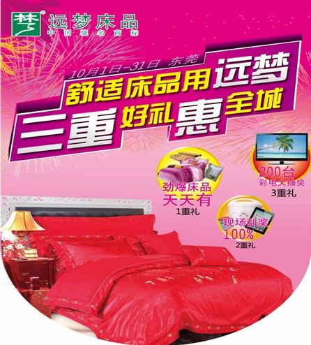 2012-10-10金秋十月,國慶佳節。遠夢(mèng)家居與民同慶,回饋消費者,特推出“三重好禮惠全程”感恩促銷(xiāo)活動(dòng);顒(dòng)時(shí)間:2012年10月1日至2012年10月31日,活動(dòng)區域:東莞全城中遠夢(mèng)賣(mài)場(chǎng)及遠夢(mèng)專(zhuān)賣(mài)店。本次活動(dòng)細則:活動(dòng)一重:勁爆床品天天有賀中秋,慶國慶,遠夢(mèng)品牌勁爆勢在必行;顒(dòng)期間,天天推出爆款產(chǎn)品,詳見(jiàn)海報。...[繼續閱讀] -