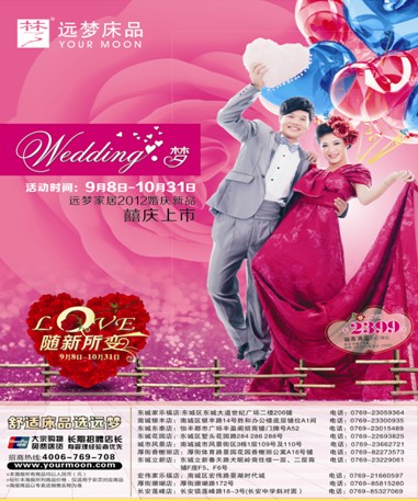 2012-10-12金秋十月,在這個(gè)碩果累累的季節,愛(ài)情的花朵也結出了果實(shí),讓我們結婚吧,婚慶的選擇!遠夢(mèng)家居新人們推出了《Wedding•夢(mèng)》婚慶產(chǎn)品推廣活動(dòng);顒(dòng)內容:你新婚!我送禮!即日起到遠夢(mèng)家居在東莞區大部分直營(yíng)店鋪購買(mǎi)婚慶套件好禮送不停!蠶絲被、折扣券、婚紗藝術(shù)照還有豪華大禮包,隨你拿!活動(dòng)時(shí)間...[繼續閱讀] -