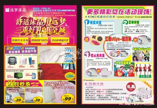 2012-11-911月3-4日,遠夢(mèng)家紡推出了“舒適床品用遠夢(mèng),三重好禮惠全城”為主題在東莞市東城世紀廣場(chǎng)外做外展系列活動(dòng)。據了解,本次活動(dòng)是遠夢(mèng)家紡今年比較大型活動(dòng);顒(dòng)開(kāi)展期間,展開(kāi)了一系列展示活動(dòng),讓更多的市民了解床品知識和掌握如何購買(mǎi)舒適實(shí)惠的床品,以創(chuàng )造舒適良好的家居環(huán)境;顒(dòng)期間,特別邀請東莞最活躍的表...[繼續閱讀] -